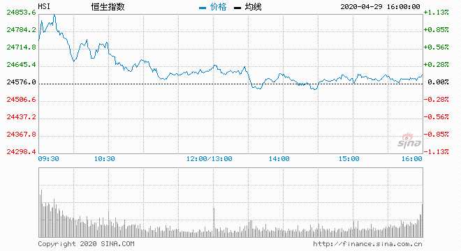 4月29日消息,美股周二收跌,科技股跌幅領(lǐng)先。隨著冠狀病毒疫情趨穩(wěn),歐洲多國及美國多州陸續(xù)重啟經(jīng)濟(jì)。投資者正評估重啟經(jīng)濟(jì)的風(fēng)險(xiǎn)與企業(yè)財(cái)報(bào)。美聯(lián)儲從今天開始召開為期兩天的貨幣政策會議。今日開盤,恒生指數(shù)高開0.85%,盤中一度漲超1%隨后漲幅收窄。截至收盤,恒生指數(shù)漲0.28%,報(bào)24643.59點(diǎn);國企指數(shù)漲0.57%;紅籌指數(shù)跌0.01%。九龍倉置業(yè)漲2.66%領(lǐng)漲藍(lán)籌。