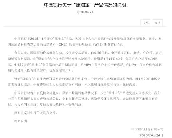 4月24日晚間,中國銀行發(fā)布公告,對客戶在疫情全球蔓延、原油市場劇烈波動情況下,投資“原油寶”產品遭受損失深感不安。我們一直在積極傾聽大家心聲和市場關切,全面審視產品設計、風險管控環(huán)節(jié)和流程,在法律框架下承擔應有責任,與客戶同舟共濟,盡最大努力維護客戶合法利益。