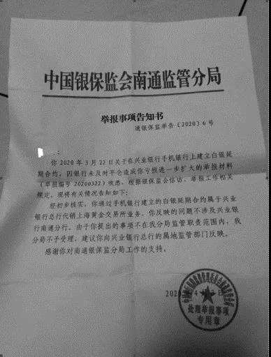 包先生提供的興業(yè)銀行推介材料顯示,正常情況下漲跌停板為6%,保證金率為9%。在3月中旬出現(xiàn)極端行情后,交易所又將白銀T+D的保證金率提高至14%。在強(qiáng)平后,包先生向銀保監(jiān)會(huì)南通監(jiān)管分局提出舉報(bào),一份加蓋公章的《舉報(bào)事項(xiàng)告知書》顯示,經(jīng)核實(shí),其所做的白銀交易屬于“興業(yè)銀行總行代銷上海黃金交易所業(yè)務(wù)”。