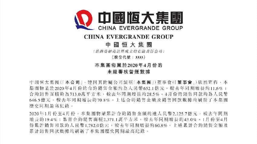 5月6日,中國(guó)恒大(3333.HK)發(fā)布公告,4月實(shí)現(xiàn)銷售652.1億,同比增長(zhǎng)11.6%;銷售面積713萬平方米,同比增長(zhǎng)28.5%;銷售回款646.5億,同比增長(zhǎng)70.8%,均創(chuàng)同期歷史新高。