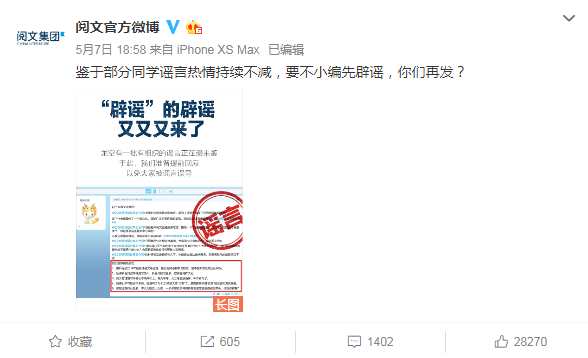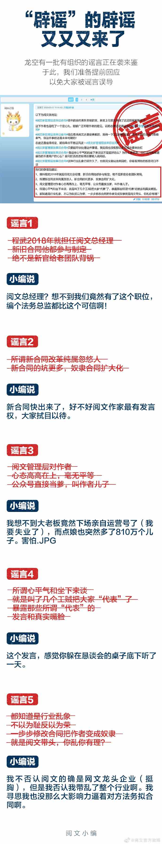 閱文集團(tuán)5月7日晚再次發(fā)微博辟謠稱,一批有組織的謠言正在襲來,鑒于此我們準(zhǔn)備提前回應(yīng),以免大家被謠言誤導(dǎo)。