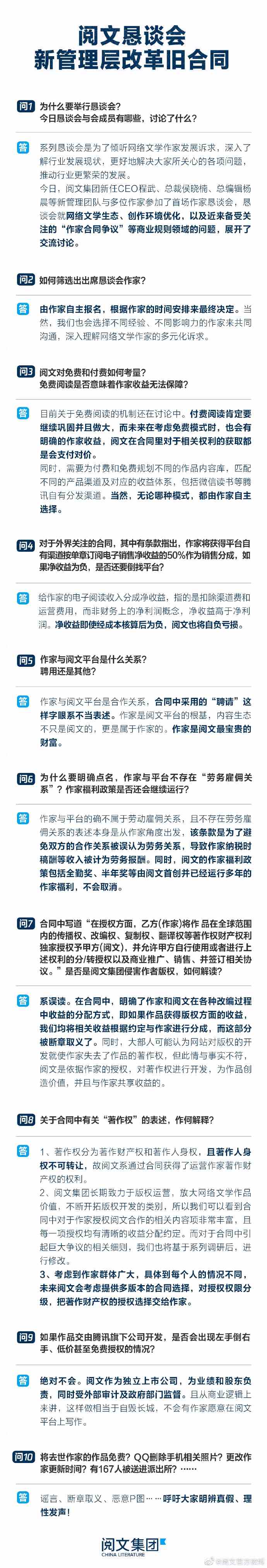 5月6日,閱文召開懇談會(huì),閱文新管理層改革舊合同,將明確著作人身權(quán)歸屬作家、財(cái)產(chǎn)權(quán)的收益規(guī)則,免付費(fèi)模式由作家選擇。