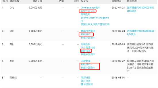 新浪港股查詢發(fā)現(xiàn),公司已完成D論融資,諾輝健康科技投資者主要包括啟明創(chuàng)投、杜克大學資產管理公司以及軟銀中國。此前,聯(lián)想旗下君聯(lián)資本多次參與投資。截至目前,諾輝健康科技共獲得逾1.26億美元融資。