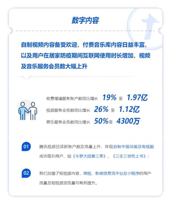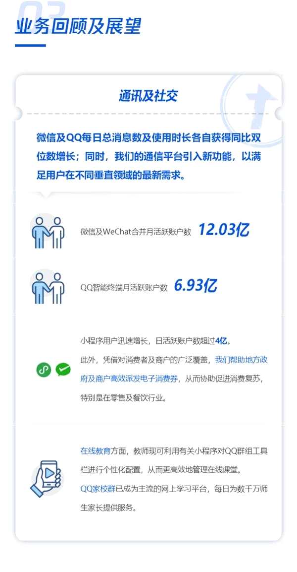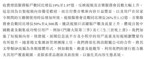 財報解釋稱,游戲在為用戶排憂解悶及讓他們互相陪伴方面發(fā)揮了重要的作用,尤其在居家令期間。在手機游戲方面,我們的工作室推出了引人入勝的游戲內(nèi)容,發(fā)行團隊亦舉辦了精彩的游戲內(nèi)活動,提高了日活躍賬戶數(shù)。例如,升級后的《王者榮耀》游戲引擎,使游戲內(nèi)道具的音頻與視覺效果質(zhì)量大大提升;此外,基于玩家定位的團隊玩法促進了用戶互動。