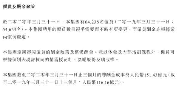 截至2020年一季度末,騰訊員工數(shù)量是64238名,去年同期為54623名。