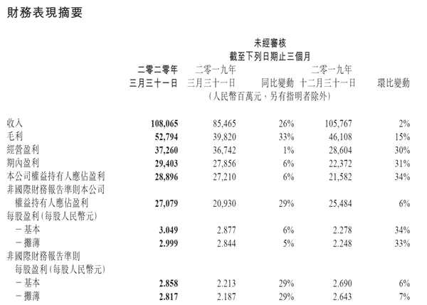 報告顯示,2020年Q1騰訊營收1080.65億,同比增長26%;凈利潤(Non-IFRS)270.79億,同比增長29%,高于市場預(yù)期。