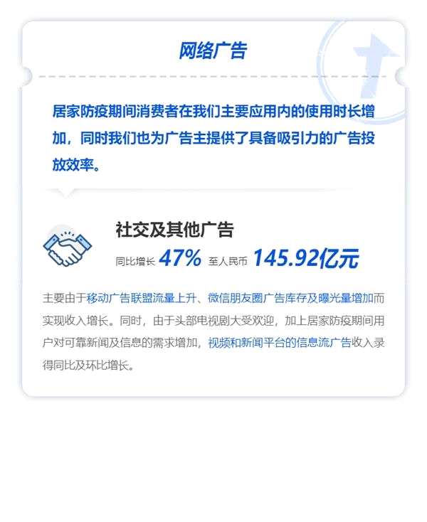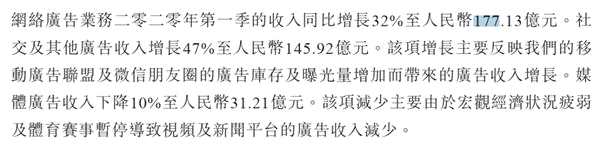 另外,媒體廣告收入下降10%至人民幣31.21億元。該項減少主要由于宏觀經(jīng)濟狀況疲弱及體育賽事暫停導(dǎo)致視頻及新聞平臺的廣告收入減少。