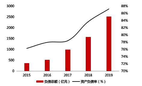 《投資時(shí)報(bào)》研究員查閱公司近幾年財(cái)報(bào)數(shù)據(jù)注意到,2015年—2019年,公司總資產(chǎn)復(fù)合年均增長(zhǎng)率為56.1%,總負(fù)債復(fù)合年均增長(zhǎng)率高達(dá)61.42%,且其資產(chǎn)和負(fù)債總額于2018年雙雙達(dá)到千億規(guī)模,資產(chǎn)負(fù)債率也由2015年末的76.29%上升至2019年末的87.24%。