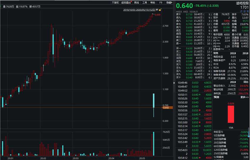 今年以來,途屹控股股價一路上漲,5個月時間從仙股一步步攀升,股價最高漲超300%。但今日一瞬間崩盤,全部漲幅被抹平,回歸去年年底水平。