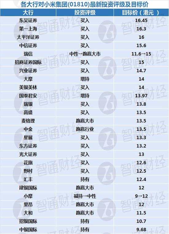 下面列出各券商對小米的最新投資評級及目標(biāo)價(jià):