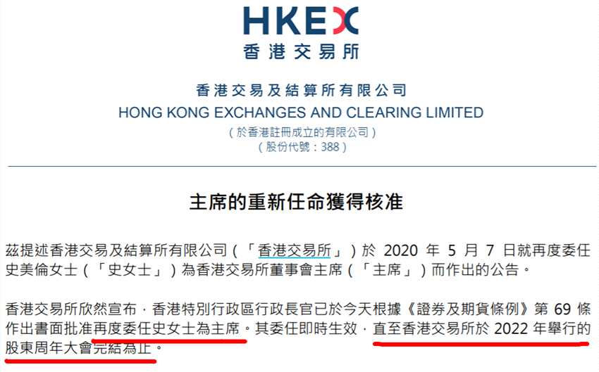 香港交易所此前公告,史美倫作為香港交易所董事及主席的任期已于2020年5月7日到期,香港特區(qū)政府再度委任史美倫為香港交易所董事會(huì)成員,任期約兩年。