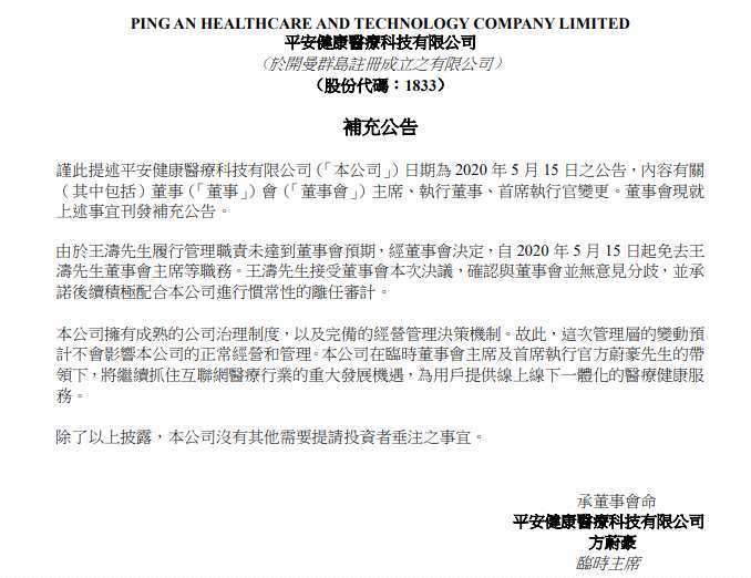 此前,5月15日晚間平安好醫(yī)生突發(fā)公告,創(chuàng)始人王濤被免職,董事會(huì)委任方蔚豪出任執(zhí)行董事、臨時(shí)董事會(huì)主席、首席執(zhí)行官。