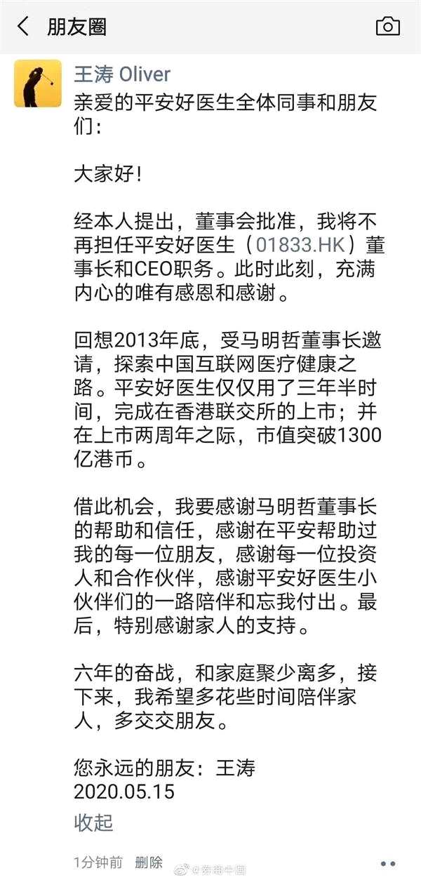 隨后,他發(fā)布朋友圈表示,感謝馬明哲董事長(zhǎng)的信任,感謝投資人和合作伙伴,表示六年奮戰(zhàn),與家庭聚少離多,希望多花時(shí)間陪伴家人。