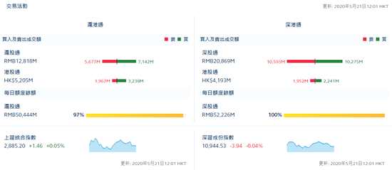 5月21日消息,截至港股股市午間收盤,北向資金凈流入11.47億元,其中,滬股通凈流入14.65億元,深股通凈流出3.18億元。港股通(滬)凈流入12.71億;港股通(深)凈流入2.89億。