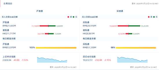 摘要: 5月22日消息,港股恒指一度暴跌5.72%,此后跌幅收窄至4.86%,國企指數(shù)跌幅縮窄至4.03%。根據(jù)港交所實時數(shù)據(jù),南向資金凈流入近30億元。