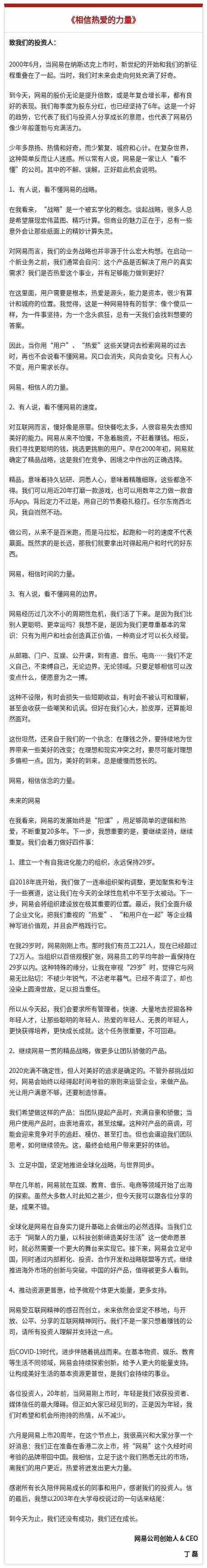 與聆訊后資料同時發(fā)布的,還有網(wǎng)易CEO丁磊上市20年來的首封致股東信。