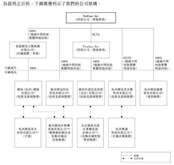 與阿里巴巴類似,此次網(wǎng)易尋求第二上市同樣采用了VIE架構(gòu),通過子公司(包括可變利益實體)于中國境內(nèi)經(jīng)營業(yè)務(wù)。