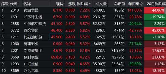 消費股集體走高,其中,微盟集團大漲7.2%,閱文集團漲5.9%,比亞迪(002594,股吧)漲5.5%,阿里影業(yè)漲5.3%,新高教漲逾5%,廣匯寶信、永達汽車等大漲。
