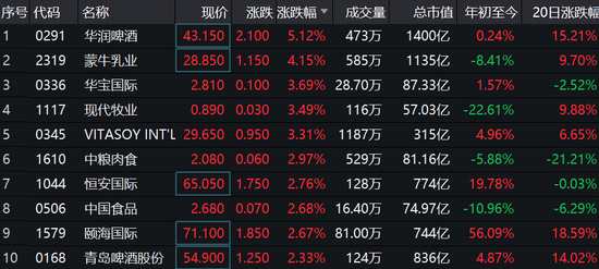 華潤啤酒大漲5%,蒙牛乳業(yè)漲超4%,現(xiàn)代牧業(yè)、中糧肉食等漲3%。