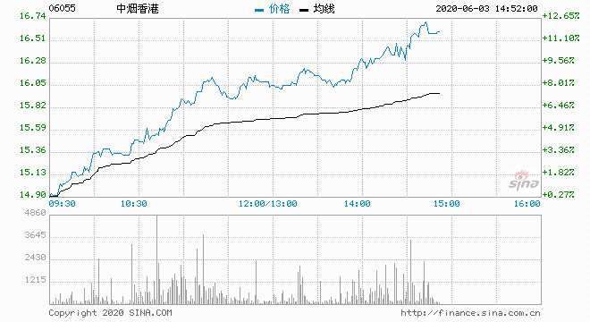 中煙(06055)升9.96%,報(bào)16.34元,最高價(jià)為16.36元,創(chuàng)1個(gè)月新高,最低價(jià)為14.86元,主動(dòng)買盤73%;成交1157.82萬(wàn)股,涉資1.84億元.以現(xiàn)價(jià)計(jì),該股暫連升4日,累計(jì)升幅12.38%。