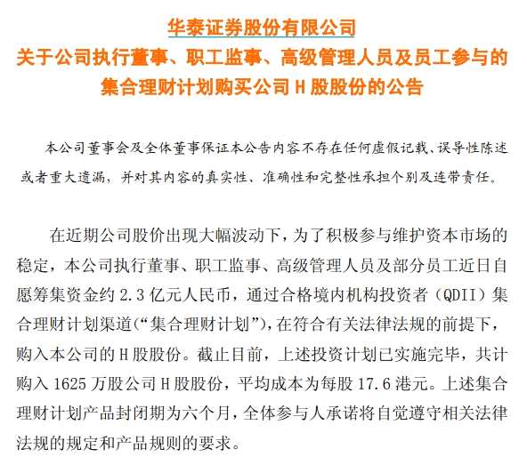 在此背景下,2015年7月16日,華泰證券公告稱(chēng),執(zhí)行董事、職工監(jiān)事、高級(jí)管理人員及部分員工近期自愿籌集資金約2.3億元人民幣,通過(guò)合格境內(nèi)機(jī)構(gòu)投資者(QDII)集合理財(cái)計(jì)劃渠道,在符合有關(guān)法律法規(guī)的前提下,購(gòu)入本公司的H股股份。