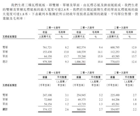 該公司生產(chǎn)3種瓦楞紙板,即雙層、單層及單面,由瓦楞芯紙及掛面紙組成。其中雙面紙板營收占比最高,2017財年、2018財年及2019財年3個財年毛利率分別為8.2%、9.4%、12%。單層和單面紙板,毛利率也有小幅波動。