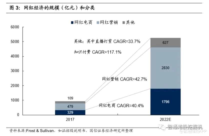 網(wǎng)紅經(jīng)濟(jì)火熱的背后,是整個(gè)產(chǎn)業(yè)的飛速狂奔。根據(jù)研究機(jī)構(gòu)Frost&Sullivan的預(yù)測(cè),2020年網(wǎng)紅經(jīng)濟(jì)的總規(guī)模將達(dá)到3400億人民幣。據(jù)國(guó)信證券(002736,股吧)研報(bào)指出,預(yù)計(jì)到2022年整個(gè)網(wǎng)紅經(jīng)濟(jì)的規(guī)模有望達(dá)到4000億以上,5年復(fù)合增速超過40%。