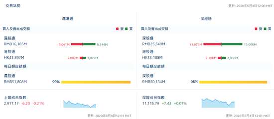 摘要: 6月4日消息,截至港股股市午間收盤,北向資金凈流入18.96億元,滬股通凈流入1.03億元,深股通凈流入17.93億元。港股通(滬)凈流出1.07億;港股通(深)凈流入6.12億。
