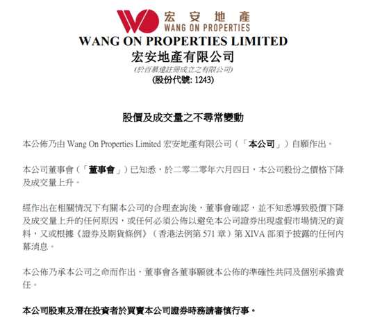 宏安地產:并不知悉導致股價下降及成交量上升原因