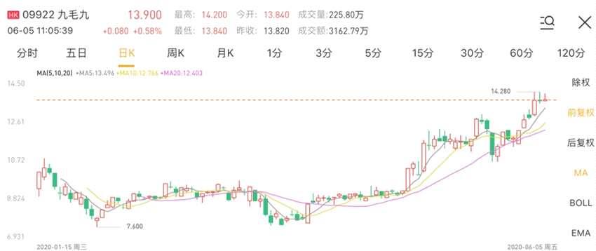 九毛九作為近期上市的當(dāng)紅熱門(mén)餐飲股,在經(jīng)歷疫情后,反而上漲勢(shì)頭更猛。以疫情期間觸及的最低價(jià)7.6港元計(jì)算,當(dāng)前股價(jià)已經(jīng)大漲超85%,而其中耗時(shí)不足5月。