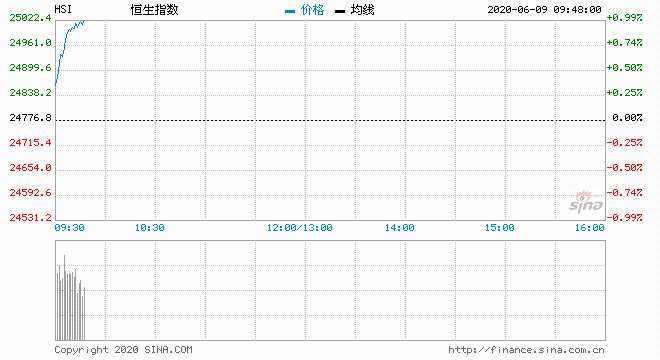 6月9日消息,美股周一收高,納指史上首次突破9900點,創(chuàng)盤中與收盤歷史最高紀錄。對解禁與重啟經(jīng)濟的樂觀預期推動股市攀升。今日開盤,今日港股開盤,恒指高開0.52%,報24906.01點;國企指數(shù)漲0.39%;紅籌指數(shù)漲0.4%。