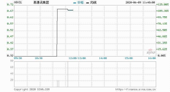 易通訊(08031)升115.62%,報(bào)0.69元,最高價(jià)為0.69元,創(chuàng)52周新高,最低價(jià)為0.69元,主動(dòng)買盤(pán)100%;成交2000股,涉資1380元.以現(xiàn)價(jià)計(jì),該股暫連升2日,累計(jì)升幅130%。