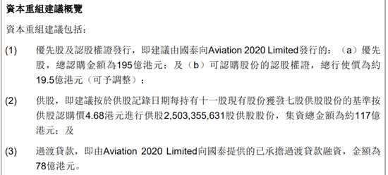 6月9日消息,國泰航空6月9日午間于港交所公告稱,將進行390億港元資本重組建議,包括發(fā)行優(yōu)先股和認股權證,及按每持有十一股現(xiàn)有股份獲發(fā)七股供股股份之基準進行供股,及過渡貸款融資。其中,優(yōu)先股認購金額為195億港元,供股發(fā)行25億股籌資117億港元,過渡貸款籌資78億港元。