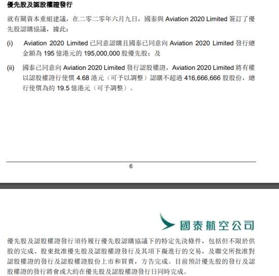 資本重組計包括發(fā)行優(yōu)先股及認股權(quán)證,建議由國泰向港府成立的Aviation 2020 Limited發(fā)行優(yōu)先股,總認購金額為195億元;及可認購股份的認股權(quán)證,總行使價為約19.5億元。