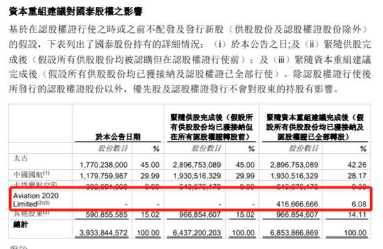 緊隨資本重組建議完成后,包括完成供股及認股權(quán)全部轉(zhuǎn)股,現(xiàn)代感管特區(qū)政府政府將持股6.08%、太古持股將由45%降至42.26%、國航持股將由29.99%降至28.17%、卡塔爾航空持股將由9.99%降至9.38%。