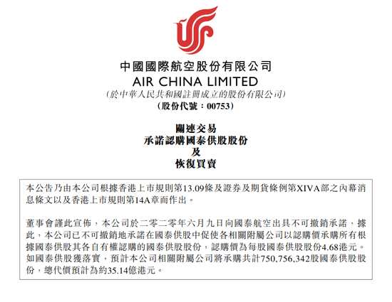 6月9日消息,中國(guó)國(guó)航:董事會(huì)謹(jǐn)此宣布,本公司于二零二零年六月九日向國(guó)泰航空出具不可撤銷承諾,據(jù)此,本公司已不可撤銷地承諾在國(guó)泰供股中促使各相關(guān)附屬公司以認(rèn)購(gòu)價(jià)承購(gòu)所有根據(jù)國(guó)泰供股其各自有權(quán)認(rèn)購(gòu)的國(guó)泰供股股份,認(rèn)購(gòu)價(jià)為每股國(guó)泰供股股份4.68港元。