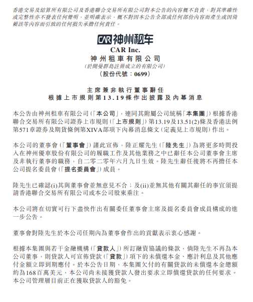 神州租車:陸正耀已辭任本公司董事會(huì)主席