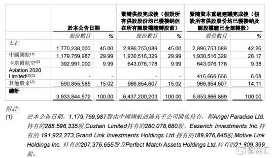 資本重組完成后,太古持有國泰航空的比例由45%降至42.26%,中國國航持有國泰航空的比例降至28.17%,卡塔爾航空持股比例降至9.38%,港府入股6.08%。