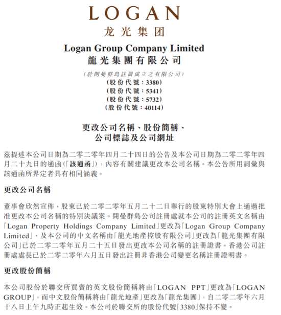 龍光地產(chǎn)將更改為龍光集團 6月18日生效