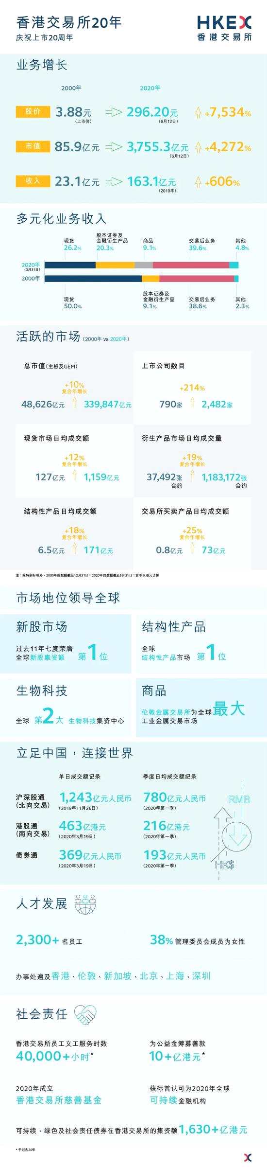 摘要: 6月12日消息,港交所發(fā)布港交所精彩20年,根據(jù)港交所數(shù)據(jù),港交所自上市以來至2020年6月12日公司股價暴漲75倍,市值凈增43倍,收入至2019年增加6倍。