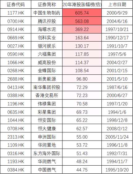 新浪港股統(tǒng)計(jì)數(shù)據(jù)發(fā)現(xiàn)(從2000年1月1日——2020年6月12日區(qū)間數(shù)據(jù)),港交所位列近20年漲幅榜第11位,中國生物制藥區(qū)間暴漲605倍,成為20年漲幅冠軍;騰訊暴漲563倍,海螺水泥(600585,股吧)暴漲369倍,科創(chuàng)實(shí)業(yè)暴漲164倍,銀河娛樂漲130倍。
