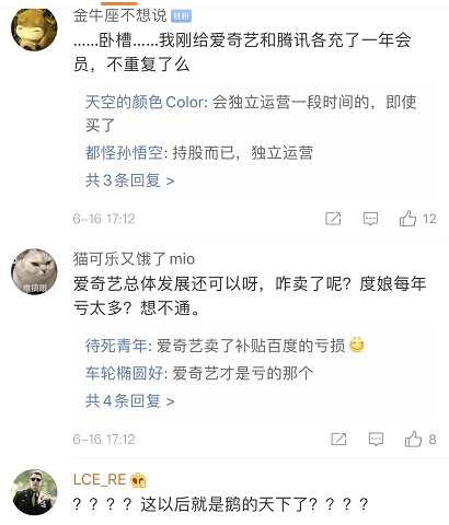 大V劉春則有疑問(wèn),控股后,愛(ài)奇藝和騰訊視頻是并存呢,還是只剩下一家?