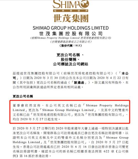 6月17日消息,世茂房地產(chǎn)發(fā)布公告稱,公司名稱由世茂房地產(chǎn)控股有限公司正式更名為世茂集團控股有限公司,2020年5月27日起生效。中文股份簡稱則由世茂房地產(chǎn)更改為世茂集團,自2020年6月24日上午九時正起生效。
