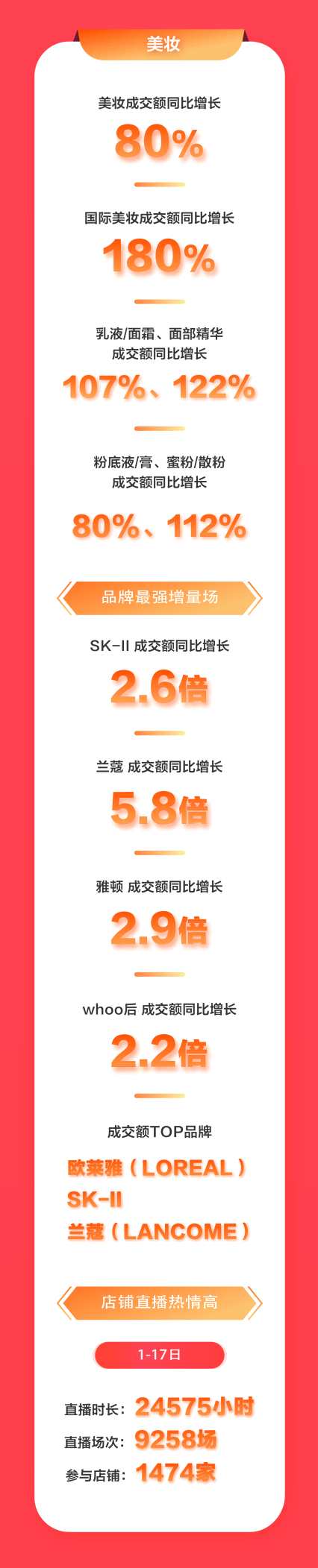 然而同樣不容忽略的是,品質(zhì)與品牌息息相關(guān),品牌本身往往就代表著品質(zhì)。消費(fèi)者選擇品牌,實(shí)際就是對(duì)其品質(zhì)的信任。這個(gè)618,高端護(hù)膚品牌增長(zhǎng)顯著,歐萊雅、SK-II、蘭蔻成為最受消費(fèi)者歡迎的TOP 3品牌,SK-II、蘭蔻 、雅頓、 whoo全天成交額同比增長(zhǎng)分別達(dá) 2.6倍、5.8倍、2.9倍、2.2倍。同時(shí),國(guó)貨美妝也有亮眼表現(xiàn),6月18日前15分鐘,百雀羚自營(yíng)旗艦店成交額同比增長(zhǎng)超300%,618當(dāng)天HFP自營(yíng)旗艦店前30分鐘同比增長(zhǎng)542%。