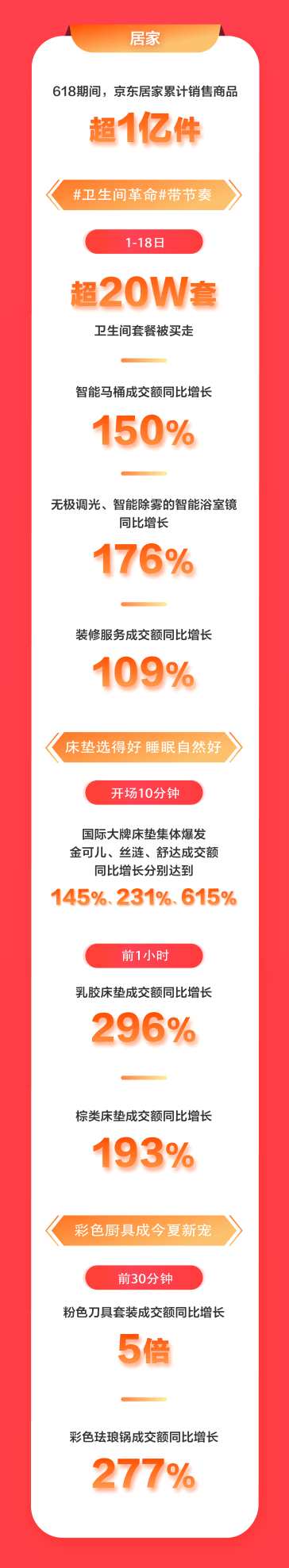 在這個(gè)京東618,實(shí)現(xiàn)品質(zhì)與品牌雙升級(jí)的又何止美妝,在家居家裝品類也同樣呈現(xiàn)出這樣的消費(fèi)升級(jí)趨勢(shì)。618期間,品質(zhì)大牌家居品牌持續(xù)贏得消費(fèi)的信賴,18日開(kāi)場(chǎng)10分鐘國(guó)際大牌床墊集體爆發(fā),金可兒、絲漣、舒達(dá)成交額同比增長(zhǎng)分別達(dá)到145%、231%、615%。芝華仕品牌6月18日成交額同比增長(zhǎng)158%,顧家品牌成交額同比增長(zhǎng)260%。