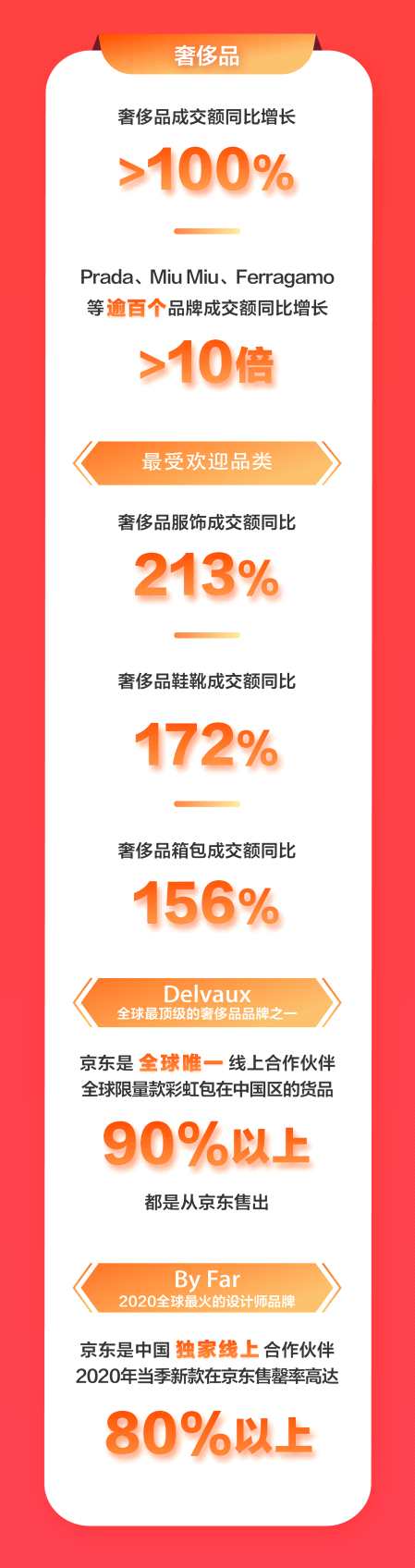當(dāng)然,最能體現(xiàn)品牌消費(fèi)的還有奢侈品。京東已經(jīng)成為眾多奢侈品品牌最重要的線上合作伙伴,6月18日奢侈品成交額同比增長(zhǎng)超100%,Prada、Miu Miu、Ferragamo等逾百個(gè)奢侈品品牌成交額同比增長(zhǎng)10倍以上。京東是全球頂級(jí)奢侈品品牌之一Delvaux全球唯一的線上合作伙伴,618期間,京東售出了Delvaux全球限量款彩虹包中國(guó)區(qū)貨品的90%。此外,京東還是2020全球最火的設(shè)計(jì)師品牌By Far中國(guó)獨(dú)家線上合作伙伴,618期間為消費(fèi)者甄選的2020年當(dāng)季新款,產(chǎn)品售罄率高達(dá)80%以上。