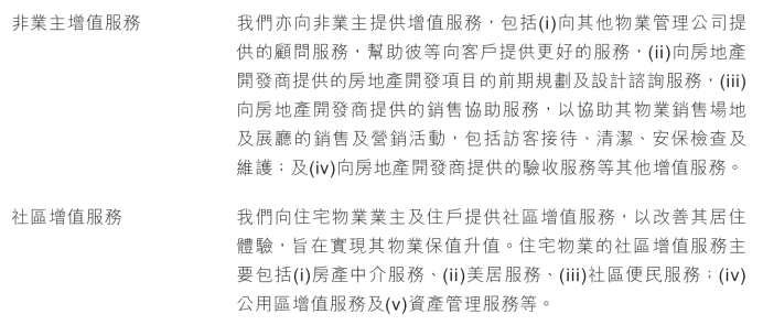 弘陽服務的業(yè)務主要分為三部分:物業(yè)管理服務、非業(yè)主增值服務,以及社區(qū)增值服務。非業(yè)主增值服務包括向其他物業(yè)管理公司提供顧問服務、向房地產(chǎn)開發(fā)商提供地產(chǎn)開發(fā)項目前期規(guī)劃及設計服務,以及向地產(chǎn)開發(fā)生提供銷售協(xié)助服務等。社區(qū)增值服務包括房產(chǎn)中介、美容服務等。