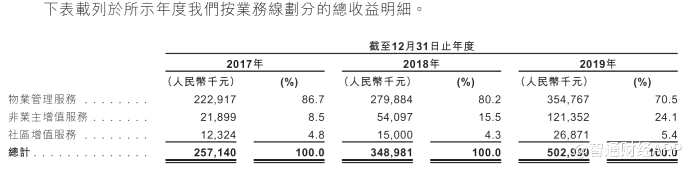 從收入構成上來看,物業(yè)管理服務是公司目前主要的收入來源,但收入占比呈下降趨勢,2017年至2019年,來自物業(yè)管理服務的收入由2.23億增至3.55億,但占總收入的比重則由86.7%降至70.5%。而另外兩項非主要業(yè)務的收入占比則不斷上升,同期,非業(yè)主增值服務由8.5%增至24.1%,社區(qū)增值服務由4.8%增至5.4%。