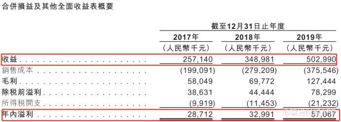 2017-2019年,公司收益分別為2.57億元人民幣(單位下同)、3.49億元以及5.03億元,年復合增長率為39.9%。 年度溢利分別為2870萬元、3300萬元以及5710萬元,復合年增長率為41.0%。