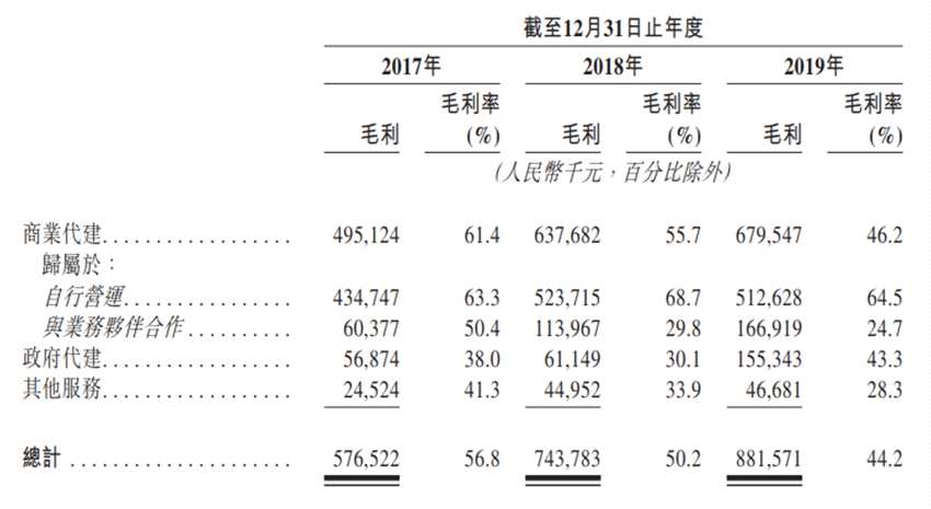 由于同業(yè)務伙伴合作,往往需支付若干不等的管理費,造成合作模式的毛利率遠比直營模式要低。綠城管理明示,在合作模式下,其收取的商業(yè)代建項目總管理費的20%-30%及政府代建項目總管理費的7%-12%。2019年商業(yè)代建合作模式的毛利率已經(jīng)降至24.7%,相較兩年前已經(jīng)折半。隨著盈利能力更弱的合作模式比重擴大,自然而然壓縮綠城管理的整體毛利率水平。